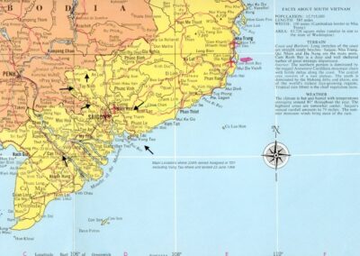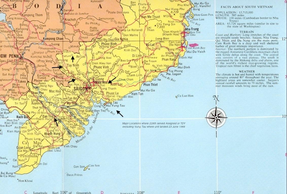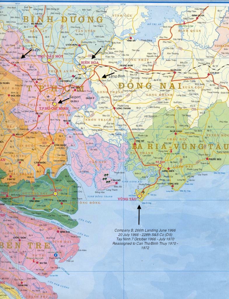 Various Maps obtained from various Websites on the Internet which apply to the 228th Supply and Service Company (Direct Support) 1966-1972. Initially, the 228th offloaded at Vung Tau, transported to Tent City A. Saigon, re-assigned to Long Binh and Bien Hoa area 1 July 1966 – 4 October 1966 with L&B Platoon and Bakery Section TDY to Cu Chi. From 7 October 1966 to on or about August 1970 the 228th primary duty station was Tay Ninh West. From 1970 to early 1972 the 228th was transferred to IV Corps approximately 90 miles south of Saigon where it was apparently inactivated after February 1972 and before November 1972. The 228th, various sections, platoons, and personnel while stationed and assigned in Tay Ninh West were in various locations on a TDY basis, of which these Maps indicate many. Long Binh, Bien Hoa, Quan Loi, Cu Chi, Trai Bi, Katum, French Fort and other. Long Giau (Blackhorse) is also shown where 228th sister Company, the 506th S&S Co (DS) was stationed. Also shown is Can Tho and Bien Thuy area of the Delta where the 228th was assigned in IV Corps 1970-1972. Also added are two maps of areas sprayed with Agent Orange as located on Internet. Order of Maps is not in sequence due to server issues, where ability to move postings about and in sequence is not functional, or problematic.